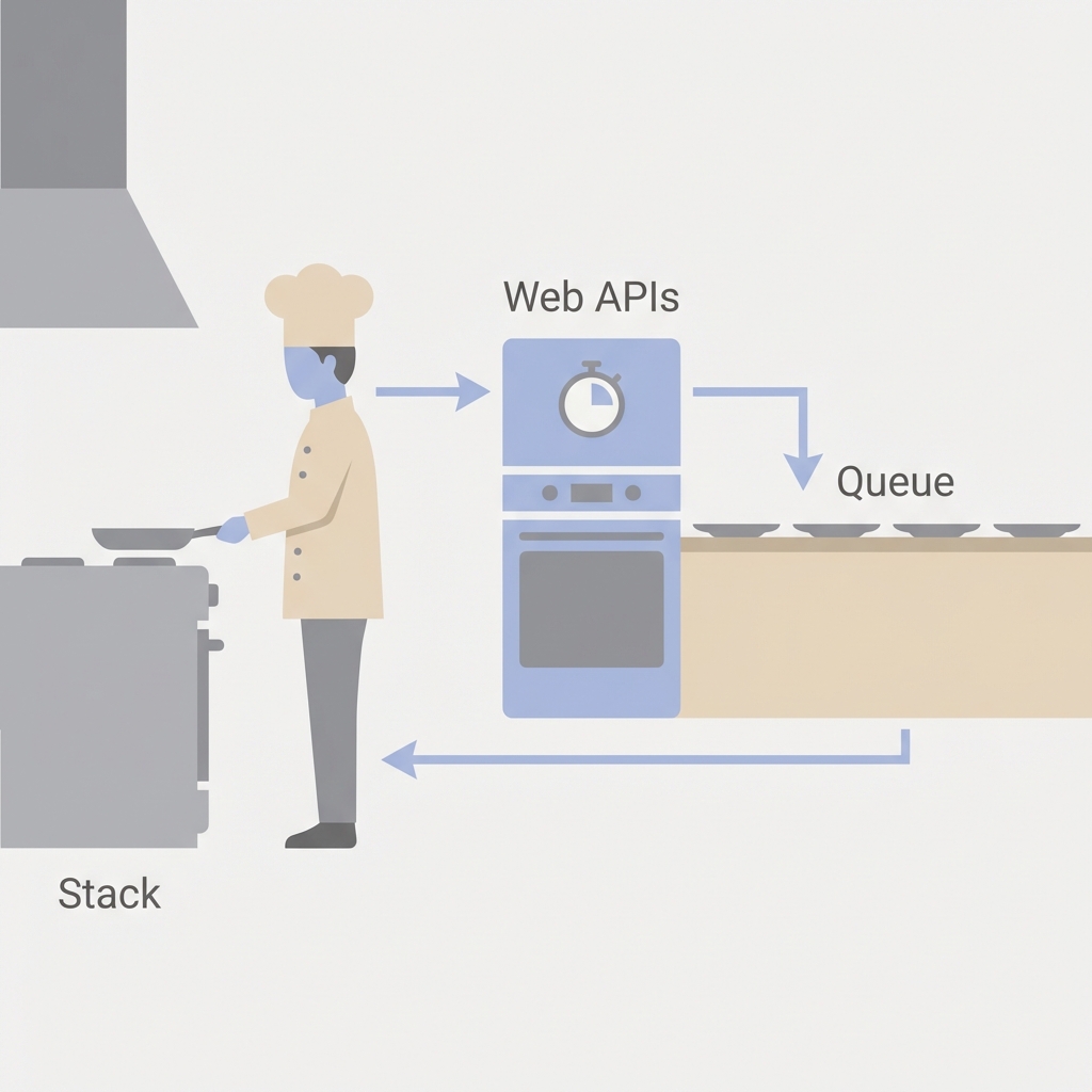 Sai lầm lớn nhất của các lập trình viên Junior là nghĩ rằng JavaScript chạy đa luồng vì nó có thể xử lý async/await. Thực tế, JS là Single-threaded (đơn luồng). Sức mạnh của nó nằm ở Event Loop.